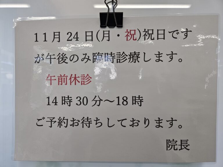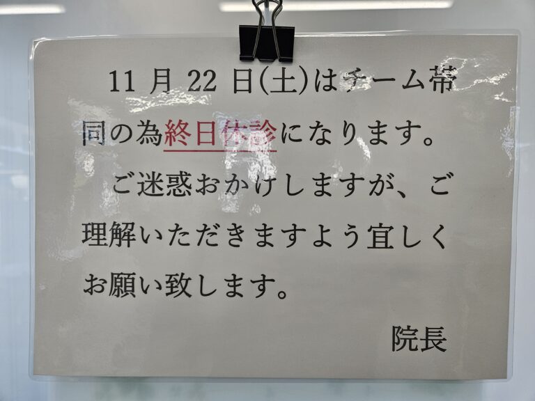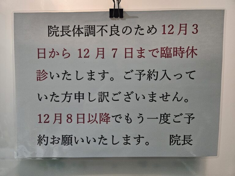 院長体調不良のため上記の期間休診させていただきます。 ご予約されていた方申し訳ございません。 12月8日から診療開始しますのでご予約お願いいたします。 休診中電話は出れませんがLINEでの問い合わせは可能となります。 ご […] -