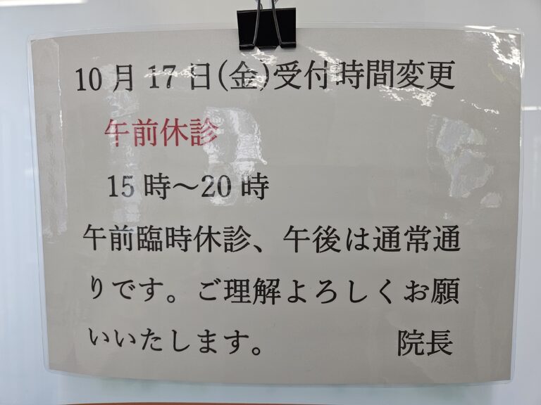 8月11日(月・祝)は祝日ですが終日診療いたします、 受付時間 9時から12時 14時30分から18時 になります。 お盆休みは8月15日(金)~8月17日(日)までになります、 ご迷惑おかけいたしますがよろしくお願いい […] -